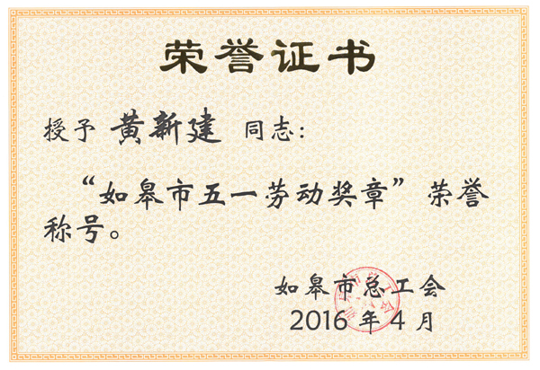集团沈忠星被授予“江苏省劳动模范”荣誉称号 集团黄新建被授予“如皋市五一劳动奖章”荣誉称号