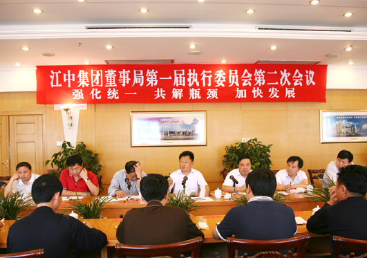 金秋十月,天高气爽。2007年10月1日至2日,江苏江中集团董事局第一届执行委员会第二次会议在江中宾馆举行。董事局执行委员会全体组成人员参加了会议。会议要求集团上下认清形势,统一思想,学赶先进,凝心聚力,共解瓶颈,奋力冲刺,加快发展,为确保实现今年总产值50亿元的目标任务而不懈奋斗。