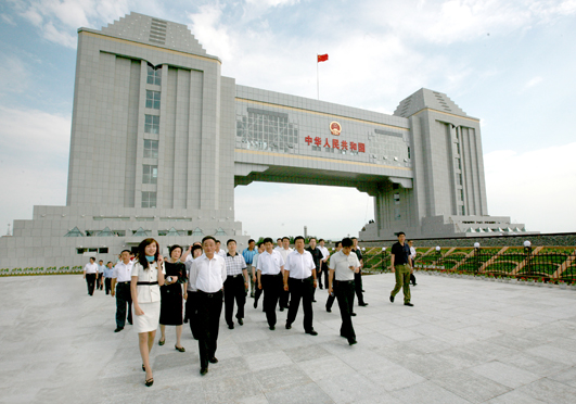 新国门坐落在内蒙古自治区满洲里市区的中俄边境,横跨中俄铁路。工程由南北两座塔楼、东西45米长的过桥钢梁和一层地下室组成。国门长105米、宽49.6米、高43.7米,总面积5905.51平方米。新建的第五代国门一层为大厅、贵宾休息室、旅游纪念品商场和游客中心;二层以观光休闲、展览为主,南北塔楼设有观光电梯,国门建成后将成为国家重点旅游景点和重要的爱国主义教育基地之一。