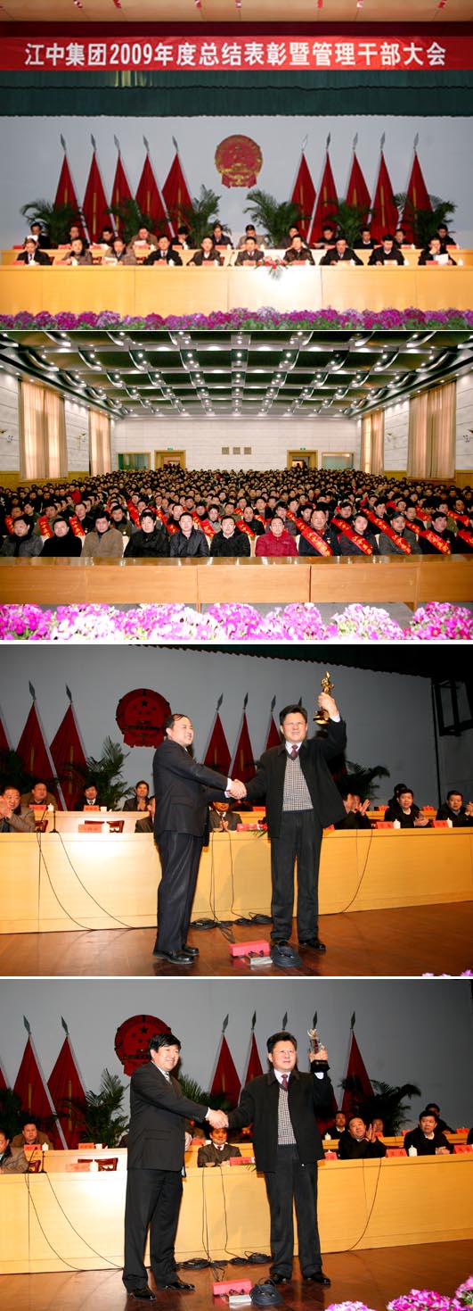 2009年2月18日上午,江中集团2009年度总结表彰暨管理干部大会在培训中心大礼堂隆重召开,表彰奖励为企业发展作出突出贡献的先进集体和劳动模范,动员全体干部和职工学赶先进,同心协力,真抓实干,奋勇争先,确保集团持续、快速、和谐向前发展。如皋市委常委、副市长马建明,市建工局局长冯昕,吴窑镇党委书记、镇长赵宏祥应邀出席大会,并在主席台就座。集团领导班子成员,总公司部室全体人员,各下属公司全体班组长以上管理人员和职工代表1000多人出席会议。
