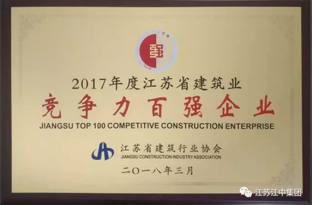 江中集团连续荣获“江苏建筑业企业竞争力百强企业”荣誉称号。