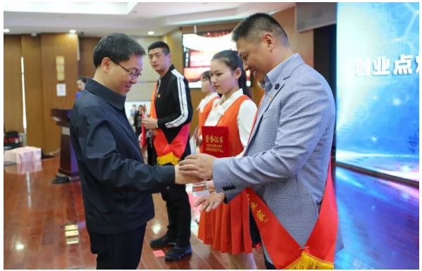 ▲市委常委、市委组织部部长、统战部部长缪爱诚为沈锋总裁颁奖